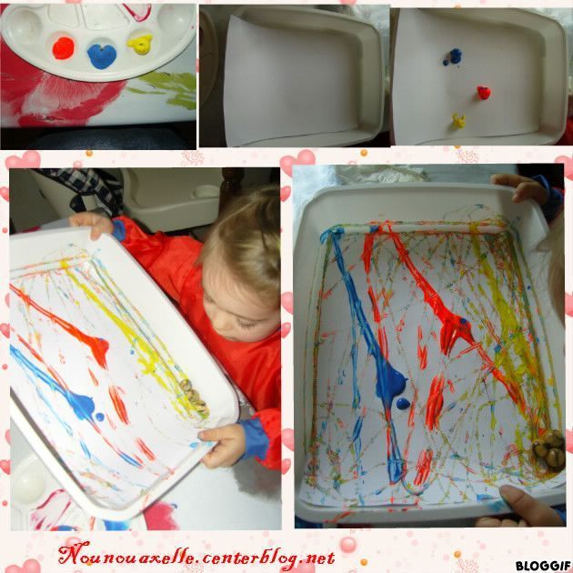 On prend des billes que l'on recouvre de peinture. Dans un bac, on pose une feuille, les billes et on fait glisser les billes de gauche à droite.